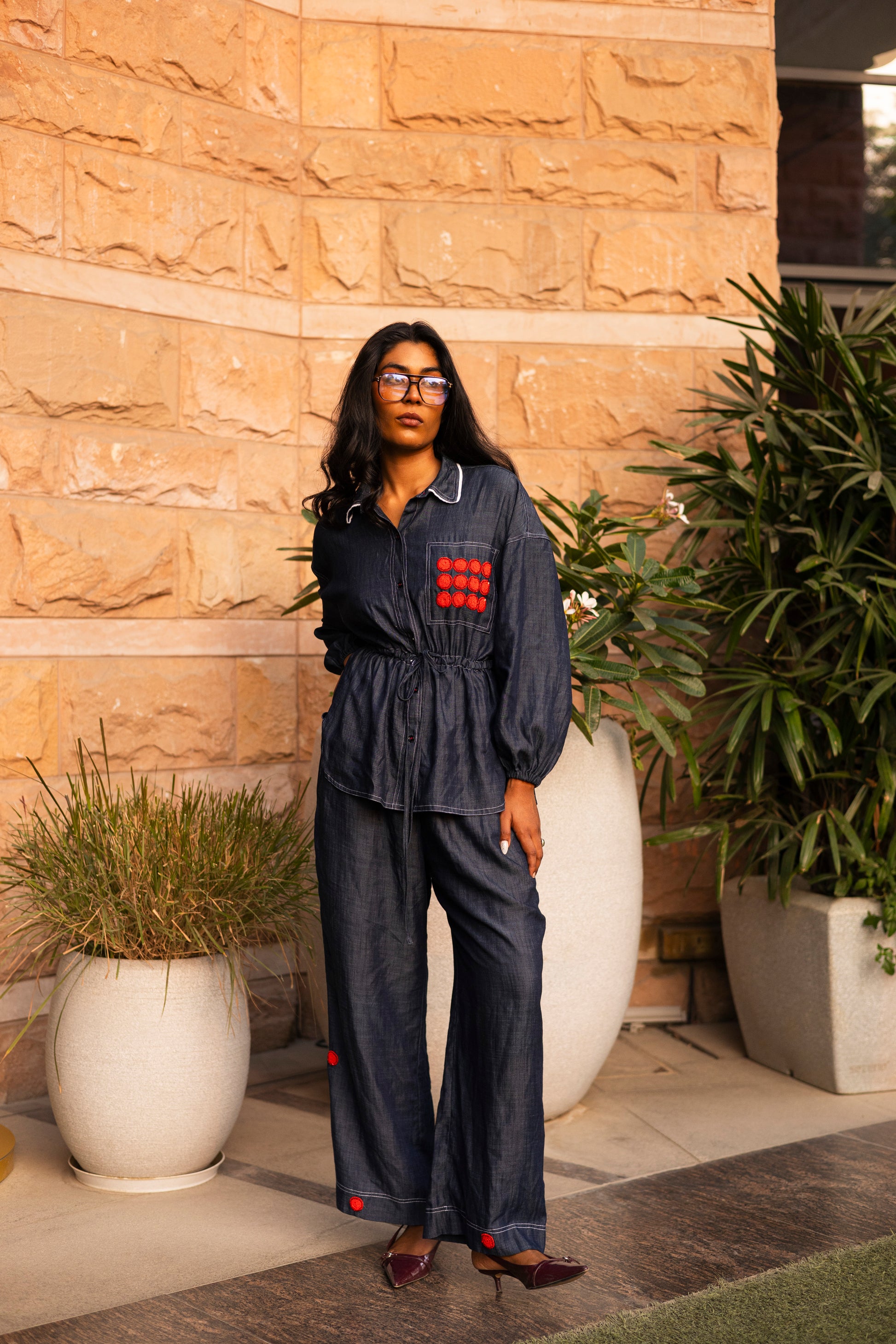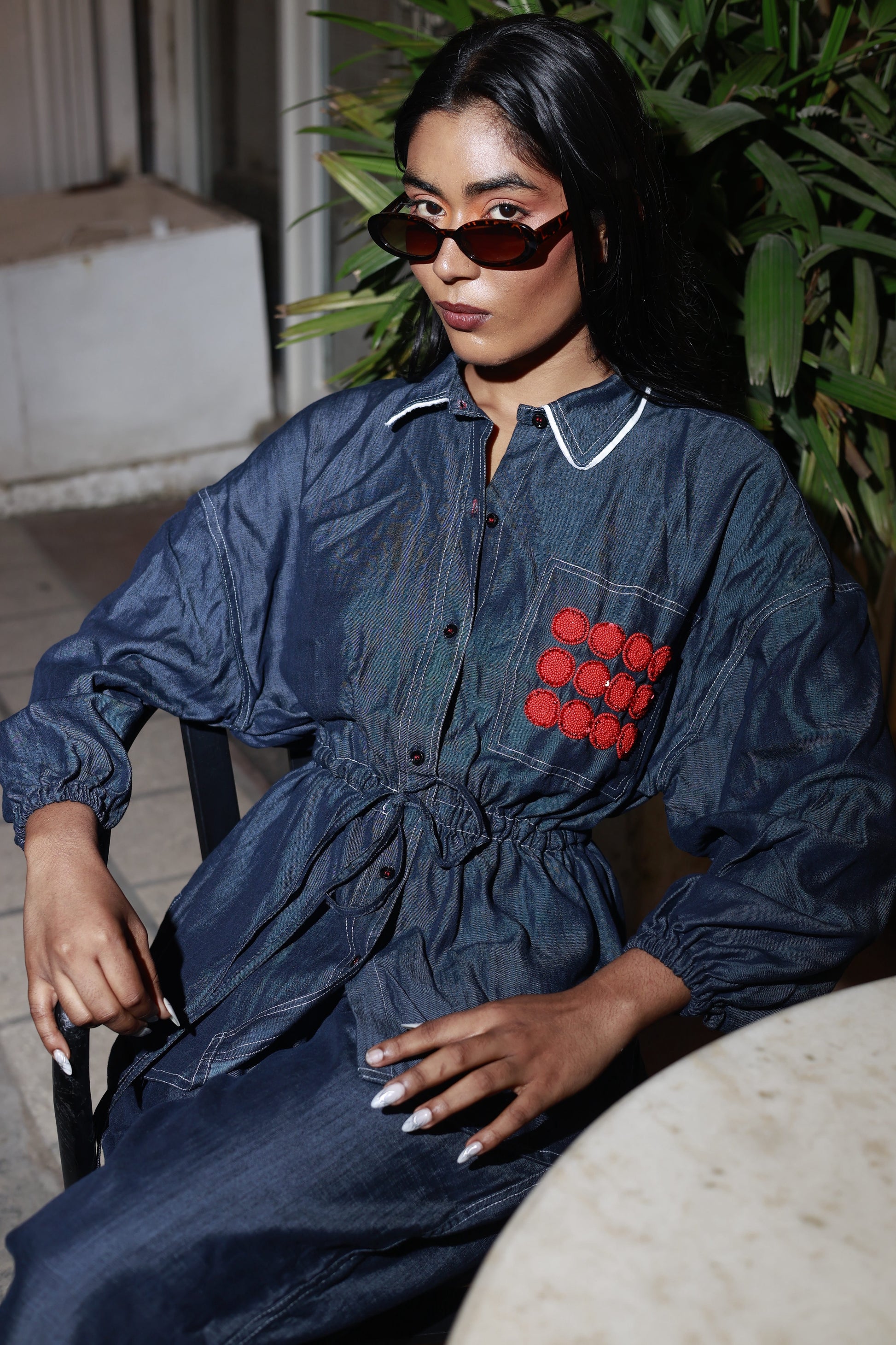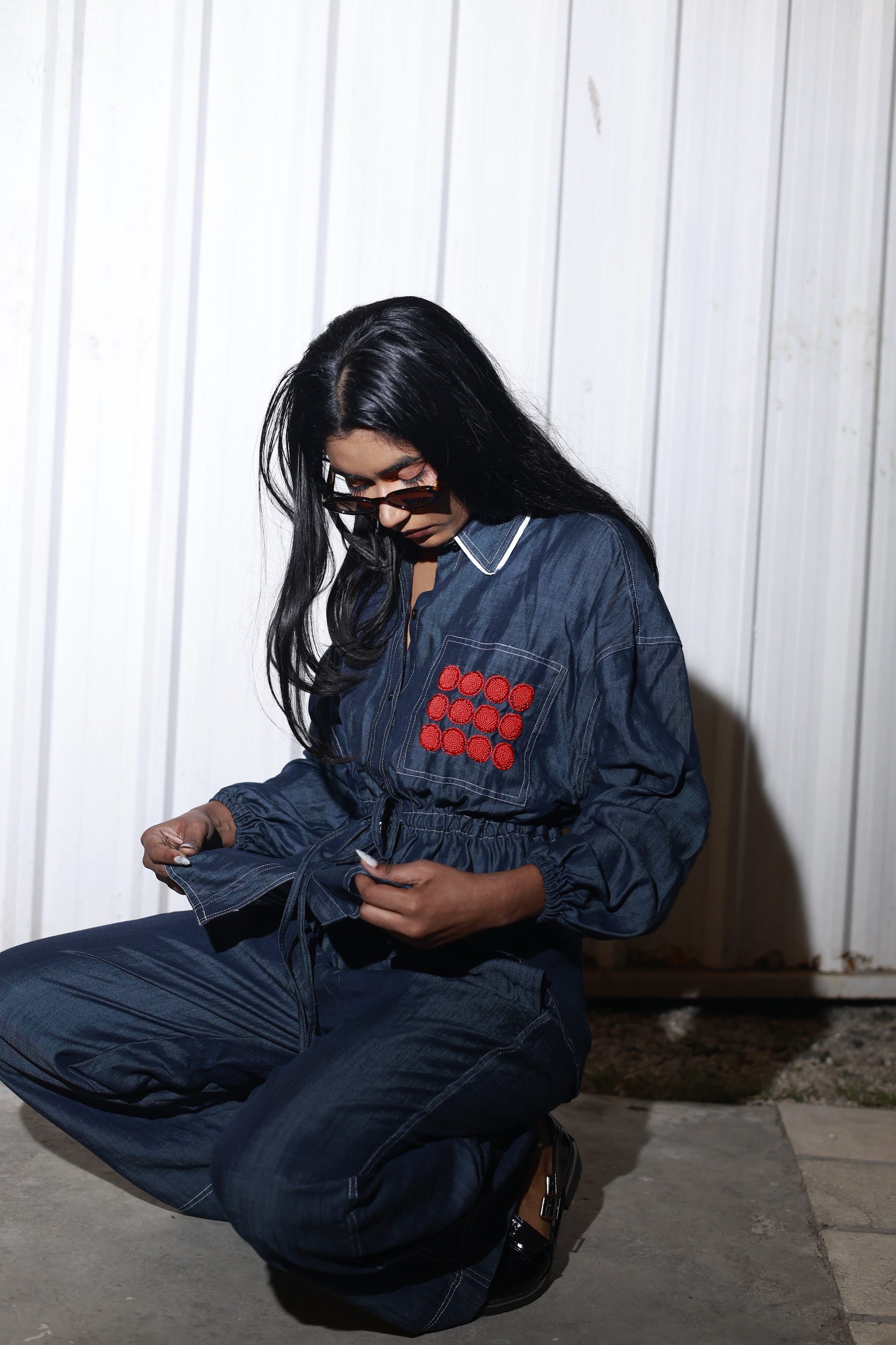 The red circular embroidery adds a bold twist, while the adjustable waist tie keeps things relaxed and flattering. Wear it together or mix it up—either way, it’s denim with a sense of humour.