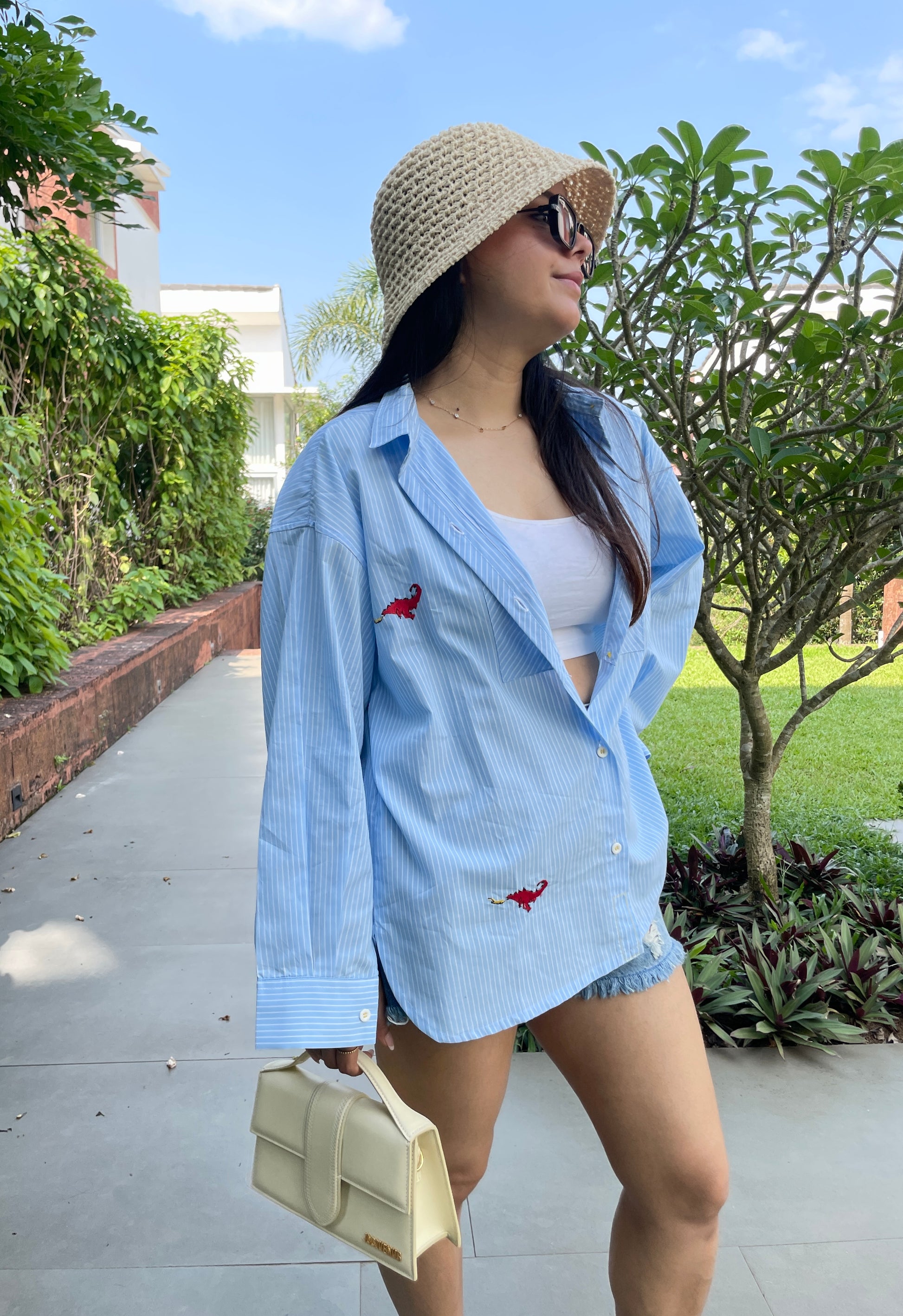 Easy, breezy, effortlessly cool. Our powder-blue striped oversized shirt is designed for days when comfort meets a touch of quirk. Crafted in soft breathable cotton, it features subtle red dragon embroidery—adding that signature Camomile twist without shouting for attention.