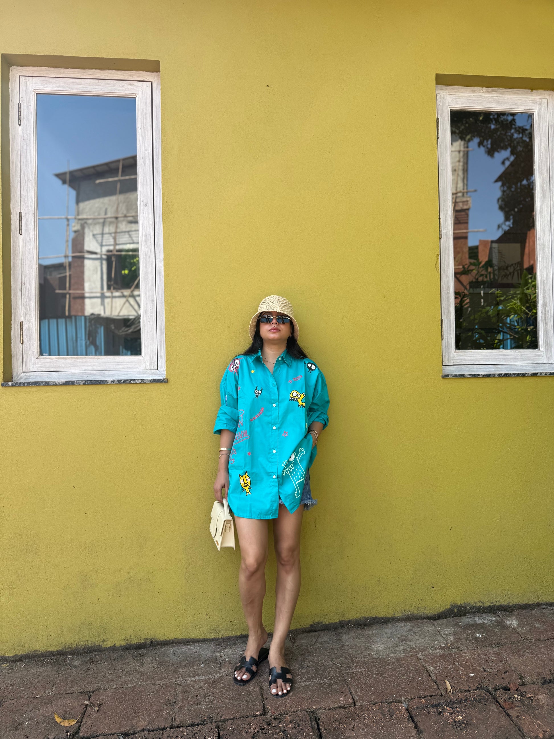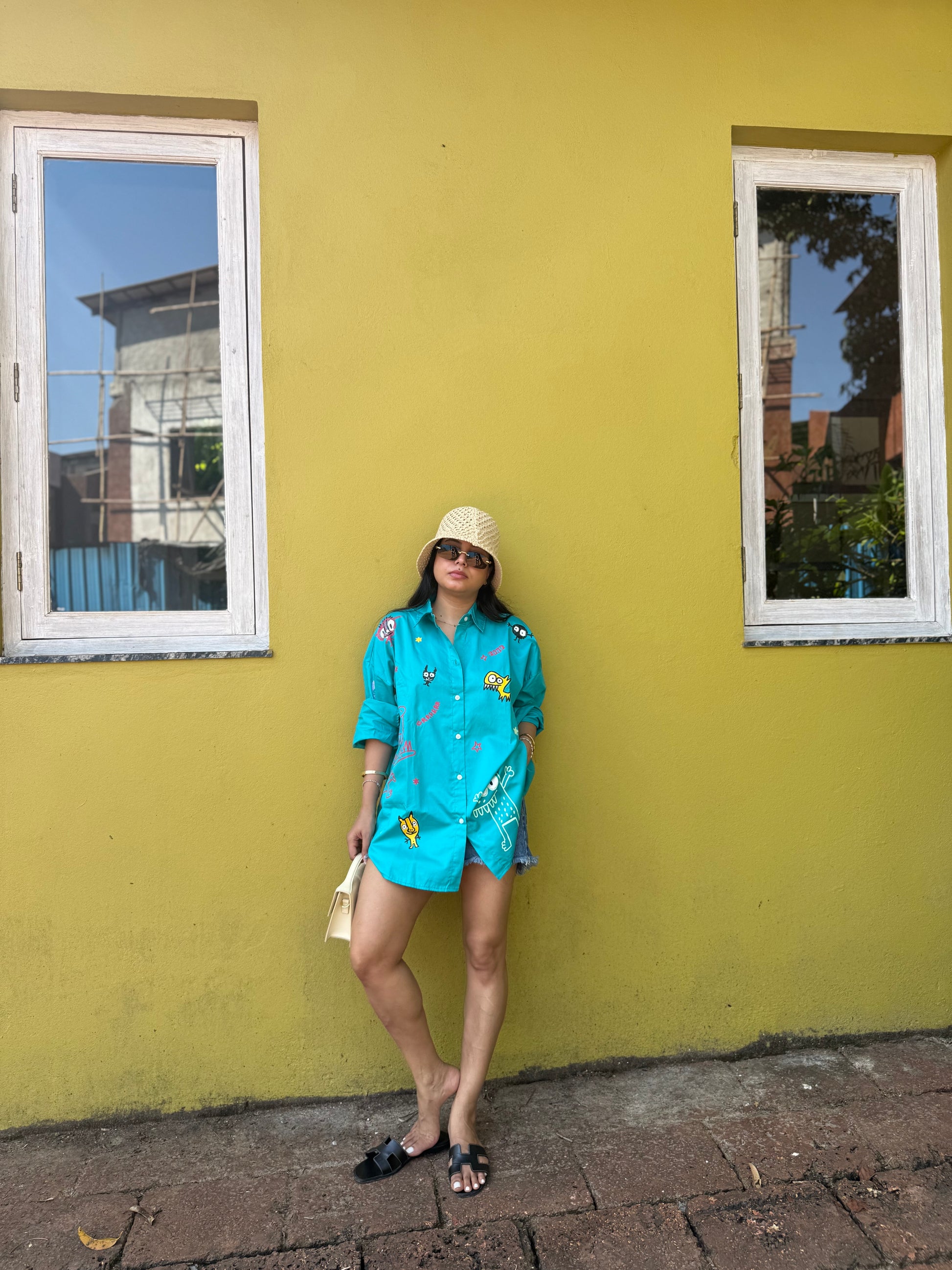 This oversized turquoise shirt is splashed with quirky, hand-drawn doodles that bring out pure vacation energy — think bold, carefree, and effortlessly fun. Crafted from soft, breathable cotton, it’s made for sunny escapes, street strolls, and spontaneous plans that turn into stories. Pair it with denim, layer it over a swimsuit, or style it solo — Pablo doesn’t follow trends, it paints its own.